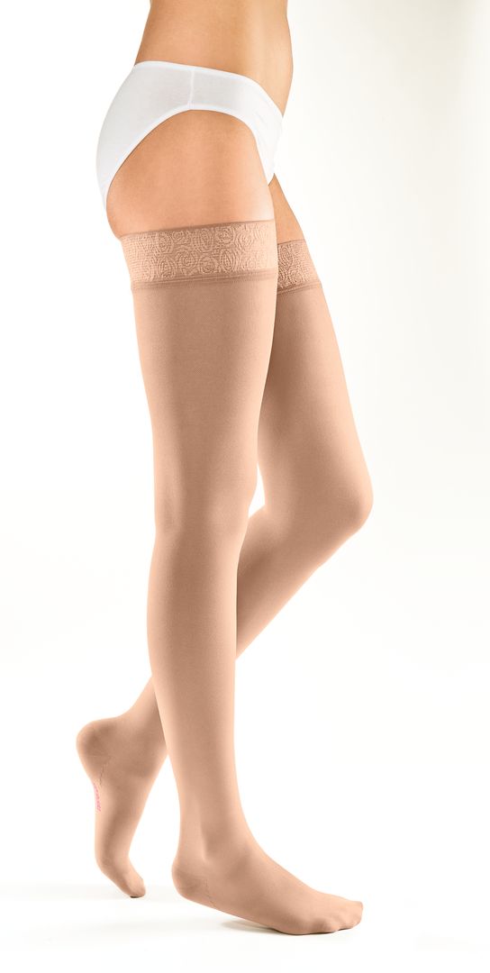 Компрессионные чулки 2-ого класса компрессии mediven elegance на широкое бедрос кружевной резинкой на силиконовой основе для женщин, заботящихся о здоровье вен и стильном внешнем виде.
